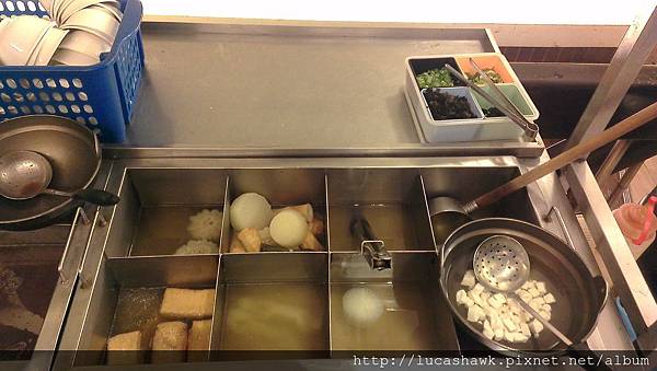 聽說下面的推車內的關東煮都是當天現煮賣完就沒囉!!趕快下去點~~(奔),挖~~點好後還會幫客人切好,附上微辣的關東煮醬,這個關東煮醬相當好吃~~一定要沾,保證提味,關東煮的湯是柴魚湯,可以加湯喔~~甘甜呀~~特別推薦他們家的蘿蔔好吃,還有苦瓜鑲肉,好天然的味道~~黑輪也是扎實的魚漿喔~~