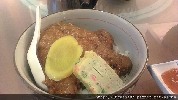 傳說中的排骨飯,超級大碗的啦~瞧瞧那隻渺小的湯匙,裡面有醬油滷白菜、兩片醃蘿蔔、一塊玉子燒,超大塊的滷排骨就這樣蓋上去,皮薄肉厚,