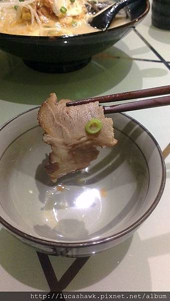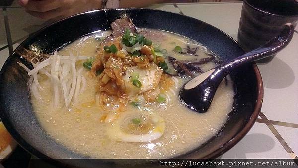 泡菜拉麵,算是台式泡菜的口味,辣味夠,不酸,不會死鹹,這間標榜豚骨拉麵,這湯頭著實濃郁~叉燒的肉也蠻好吃的,但是就是有點溫,不知道是店裡冷氣太強還是什麼,總覺得端上來的時候拉麵不夠燙,雖然很好入口,但是少了那種熱呼呼的感覺。 裡面有叉燒、豆芽、糖心蛋、木耳。