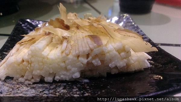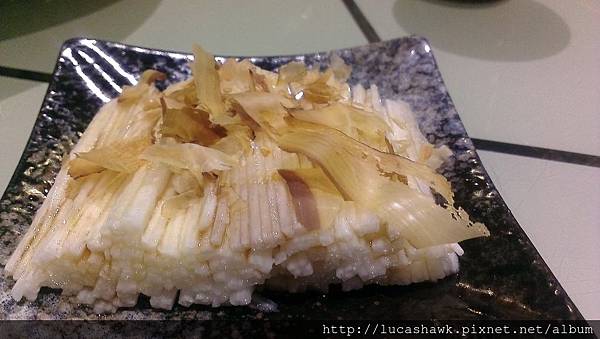 一盤山藥,切的細細的還蠻好入口的,簡單用醬油跟柴魚片提味,清爽又舒服~~