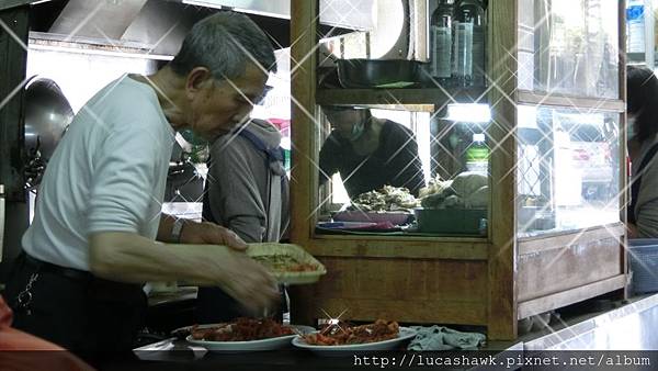 阿公也脫下外套一起出菜囉!!因為客人太多,大部分時間阿公會幫忙安排位置,大多時間他會幫忙處理簡單的佐料,瞧他正在幫溪蝦擺盤。