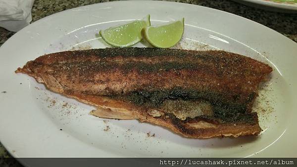 乾煎魚肚,應該是虱目魚肚,我是用魚刺分辨的啦~~哈,煎得乾乾的,魚肉卻又保有鮮甜,不會乾柴,雖然是灑滿胡椒但是不會太辣,用新鮮檸檬提味,真的很好吃喔!!