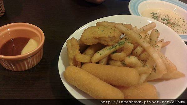 我點了一....碗綜合炸物 ( ̄3 ̄)a,薯條炸得相當酥脆,就算放到冷也一樣脆喔..雞塊就沒那們驚艷了...