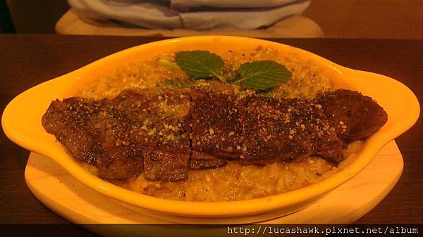 我同事點了牛小排燉飯,看他吃的津津有味,看起來飯有點軟爛,不過應該只是上面的湯汁的視覺效果吧~~
