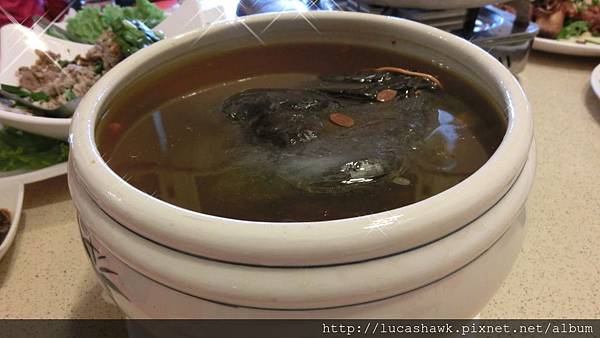 黃金蟲草燉雞湯,這湯好~看起來很油膩,但是喝起來卻相當爽口,而且我等了一會才吃雞肉,裡面那隻烏骨雞的雞肉依然細嫩好吃呀~~
