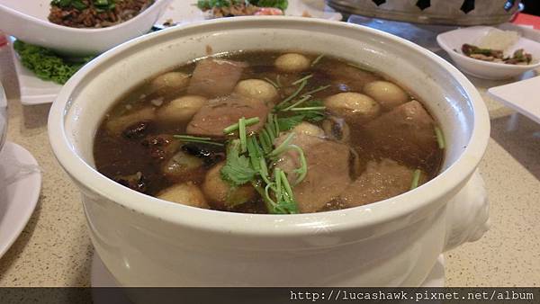 精燉佛跳牆,又是一到常見的桌菜,說好的客家料理呢~~但是這鍋佛跳牆真是豐富呀~讓我又再度屈服了~芋頭鬆軟、鳥蛋炸得恰到好處、豬腳嫩、排骨酥,湯頭當然是好喝呀~~