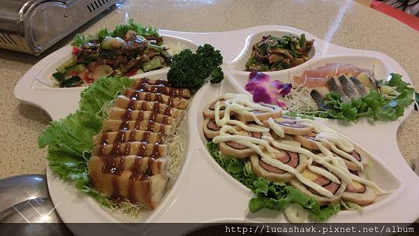 吉祥五福料理,冷盤有生魚片、牛腱肉、鯊魚煙、火腿捲、還有一味有著脆脆的口感還有像是豬肝的小菜,很好吃,但我不知道是什麼,哈~應該要去問一下的。