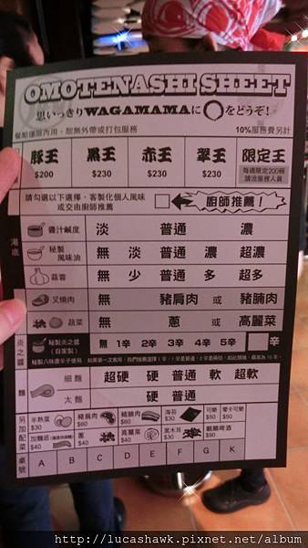 過來之後,會有工作人員拿菜單給你,原則上一人一張,工作人員會幫你介紹跟拿麵條的給你參考,有什麼點餐的問題都可以在這時候詢問他們