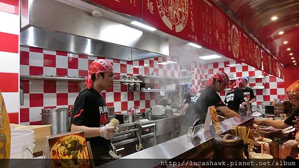 等待的時候,來瞧瞧廚師的煮麵功夫吧~我發現師傅煮麵以前,都會把麵條彎曲的地方互相摩擦一下才下鍋,再來,我最愛的一部分就是麵煮好了~~就會像日本美食節目所看到的一樣,會把麵拋到空中瀝乾水分,完全得分,另外,在最旁邊的師傅負責將湯碗先放入溫水中溫熱,等待師傅上面後,再由站在吧檯外的調味人員負責加料調成每一碗客製化的拉麵。