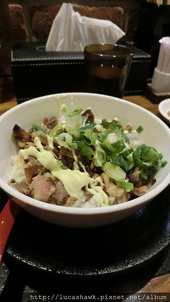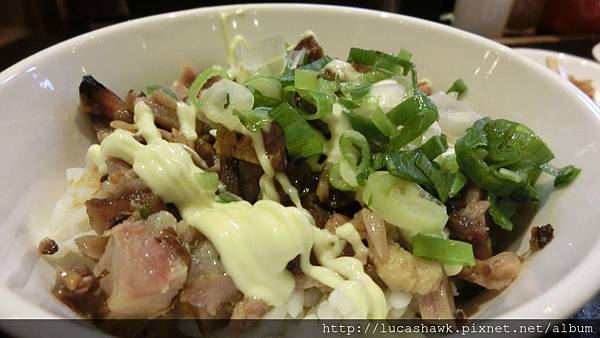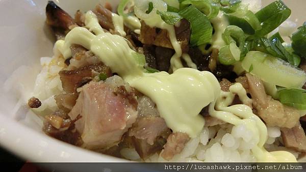 這叉燒飯上面有滿滿的蔥花跟叉燒塊,香菇、還有美乃滋,別怕~~不會太油膩,剛剛好!!叉燒用塊狀呈現很棒,口感Q彈,完全呈現這頭豬的原味~粉嫩叉燒是不是相當誘人呀!!搭配上沙拉醬!這碗飯的層次就出來了!!!或是搭配剛剛的小菜也是一種選擇喔!!得分!!