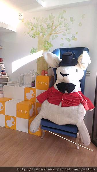 厚重的大門內,還有一隻超大隻的兔子等著各位進來,旁邊的積木堆砌有如禮物堆,配色相當優雅又柔和。