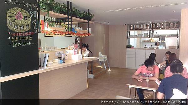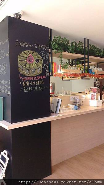 簡約的小吧台,用盆栽點綴,簡單的合板,還有黑板牆寫著今日的特價或是特色甜點的簡介,整個讓人覺得很舒服。