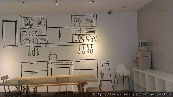 二樓,是烘培教室,諾大的落地窗,舒服的沙發,溫暖的陽光,一整個就很想躺在椅子上度過午後時光,牆壁也很有創意~~