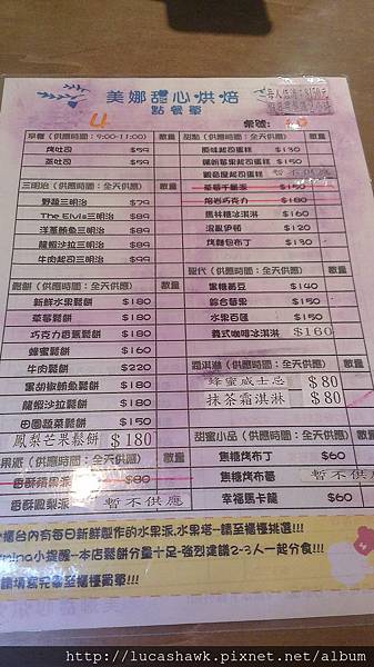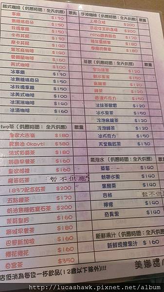 這是點菜單,雙面,一面是甜點,另一面是飲料,這裡有低消費每人$150,假日有限時用餐兩小時,其實時間上蠻夠了~~