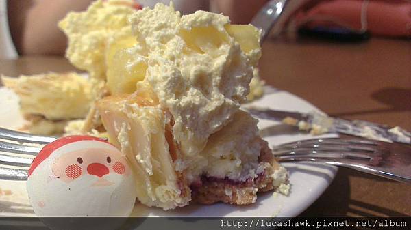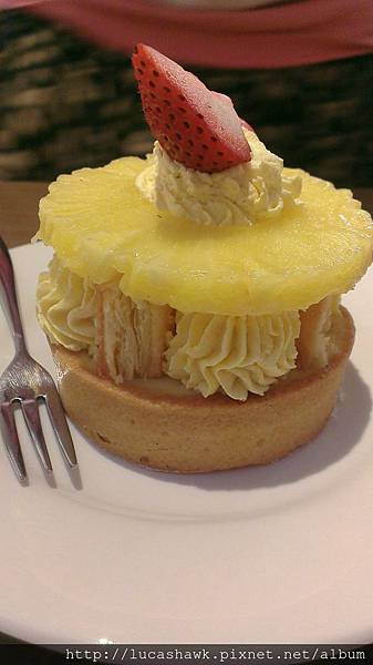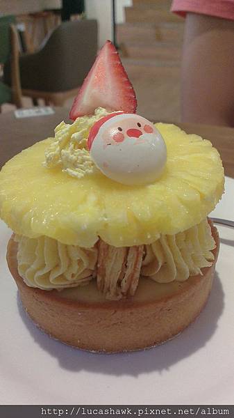 這個要去櫃檯點,就是牆壁上推薦的甜點,"台中太陽塔",利用鳳梨還有草莓,厚實的塔底餅乾,真的很扎實,還有可愛的聖誕老人糖,滿滿的卡士達醬,酸酸甜甜的鳳梨香氣很不錯,中間還有利用千層派來做搭配,整個吃起來超幸福的啦~~