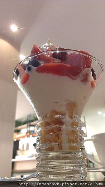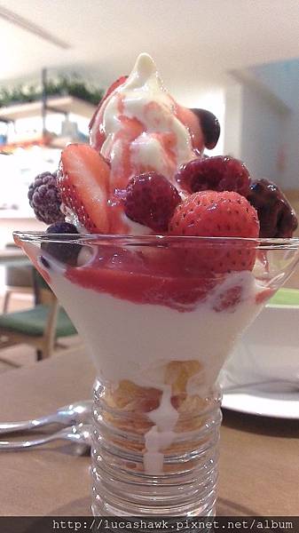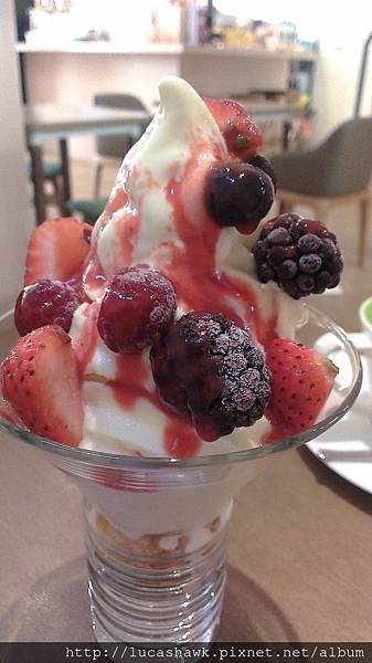 老婆一直想要吃點冰的(因為台中實在是太熱了~~),就決定點"綜合莓果聖代",濃郁的牛奶冰淇淋,新鮮的草莓、野莓,淋上一點草莓果醬,下面有香脆的玉米片,夏天就是要吃聖代,太棒啦!!!酸酸甜甜的口感搭配香濃的牛奶霜淇淋,真的很搭~~
