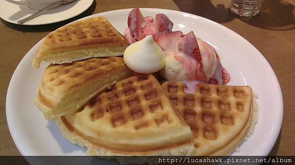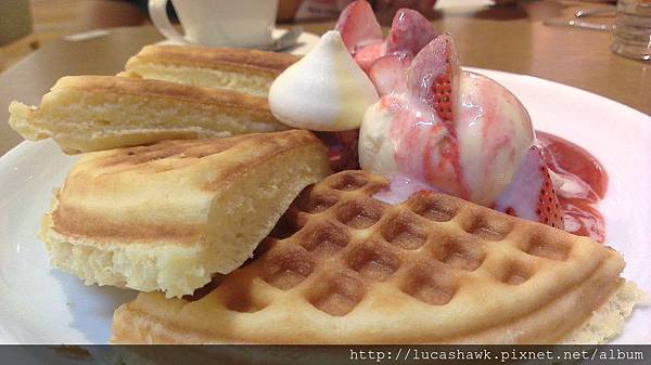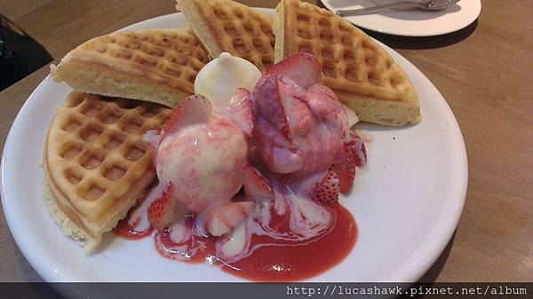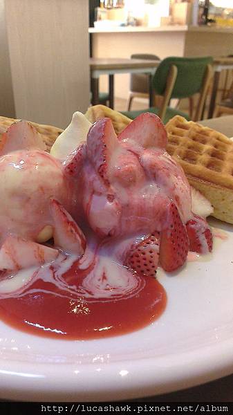 瞧瞧著厚實的鬆餅,豐富的草莓點綴,熱的鬆餅上面鋪滿香甜的香草冰淇淋在淋上酸甜的草莓醬,這根本就是極品享受阿~~太銷魂了~~~
