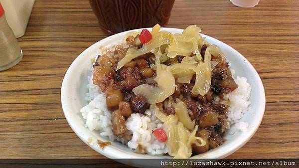 這碗魯肉飯看起來相當可口,肉燥算是較肥的那種,用醬油滷個相當漂亮,加上小辣的酸菜,不但可以解膩還多了點不同的味道,不錯~~