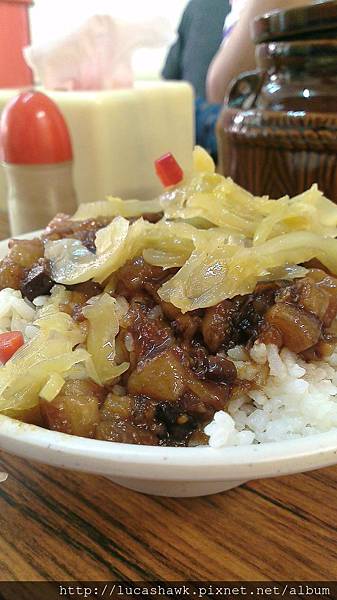 老爸點了一碗魯肉飯,不過這比較像是肉燥飯,但是他又有肉燥飯~~哈!當下沒想到,不然點兩碗來比較一下。