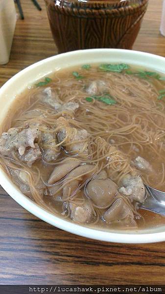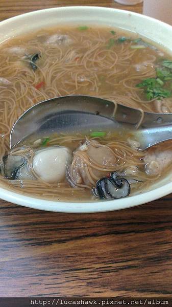 這碗麵線配料相當豐富,有赤肉羹、大腸、蚵仔,相當有料,吃蚵仔麵線我倒是第一次到有放肉羹的,口感上還不錯~瞧瞧這個蚵仔飽滿又大顆。