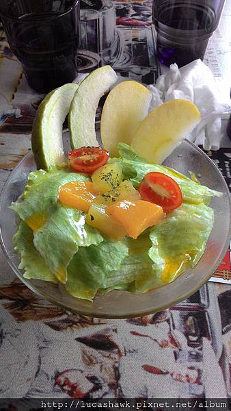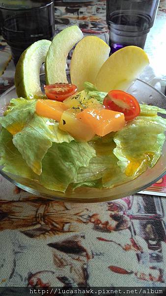 套餐有兩種選擇,可以選湯跟沙拉,還有麵包,我選擇的是清爽的沙拉,嚴格說起來,也沒很特別,下面的百香果柳橙醬倒是不錯~~但是太濃稠太甜了~有點膩,我加了一點水後,發現還蠻好喝的~~哈