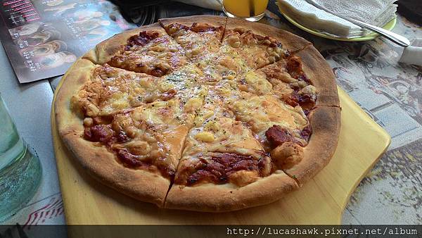 大家等了都餓了,趕快上菜吧!!!首先第一棒是超濃起司比薩,熱呼呼的剛出爐的比薩最好吃,八吋,看看上面濃郁的起司就知道這有多好吃了!!!