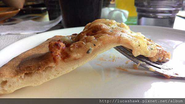 不會太硬,柔軟又不失口感的比薩,搭配香濃的起司,完全對味,一口比薩一口可樂,在這麼熱的天氣裡,完全征服我的胃呀!!!開了開了~~
