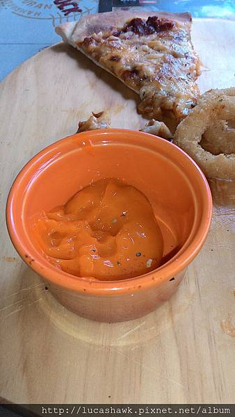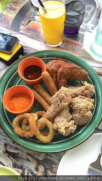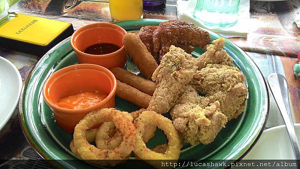 來美式餐廳吃,當然少不了拼盤了~~依序順時針介紹,一點鐘方向是酸辣雞翅、炸雞腿、魷魚圈、起司醬、BBQ醬、起司棒