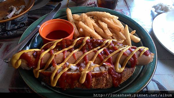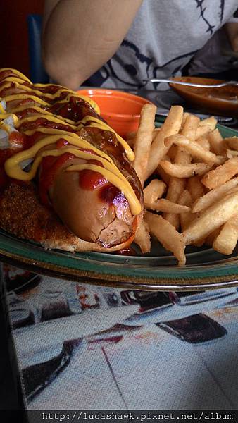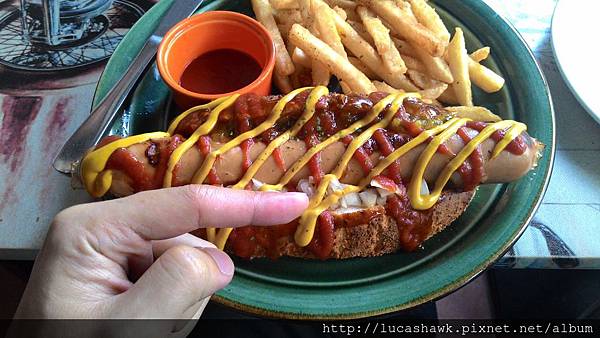 第三棒,哈雷煙燻超大熱狗堡,這是我的餐,配菜相同,瞧瞧這比我手指頭還粗的大亨堡,光看就飽了!!!