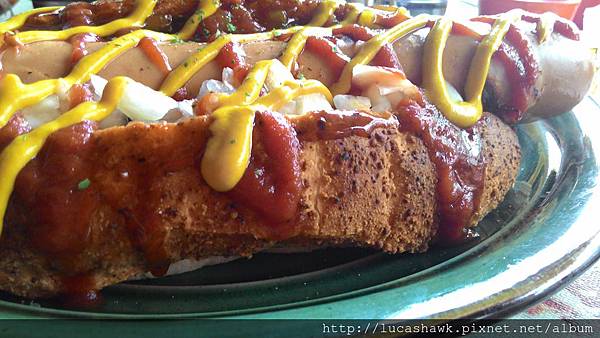 他的麵包是有烤過的喔!!所以相當有嚼勁,熱狗本身除了腸衣外,肉有那麼一點點沒那麼扎實的,但是還不錯吃啦!!哈