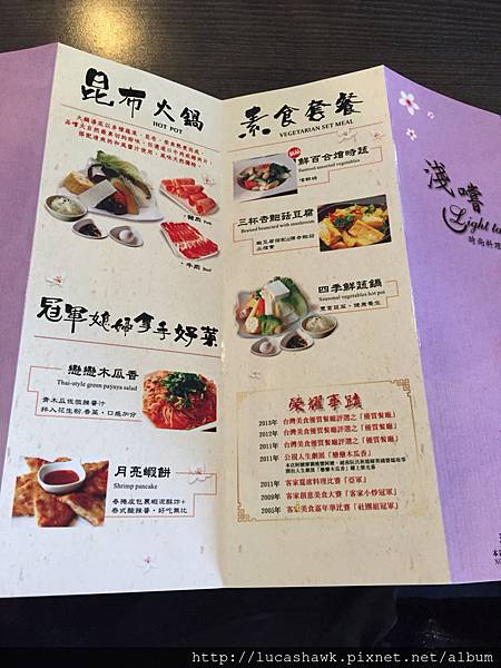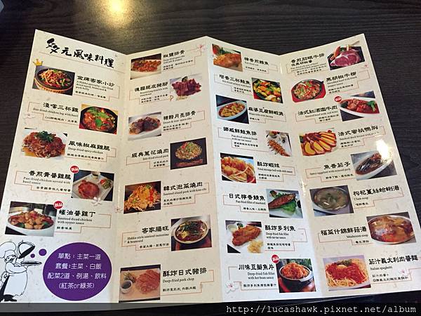 看看菜單,店家很貼心的把你點的菜都印在菜單上,讓你可以知道自己點的是什麼,我喜歡這個點菜方式,大家一桌可以單點想吃的那道菜,或是加個$60元升級成套餐,一道主菜配兩道附菜還有飲料跟湯品、白飯,飲料可以選紅茶、綠茶跟果汁。