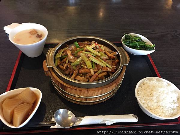 客家小炒,用木桶裝,分量好足,魷魚Q彈,肉絲香嫩,芹菜香,最重要的是這刀工,每一樣幾乎都是一樣長寬,厲害,味道很讚~不會太鹹,所以不用擔心。