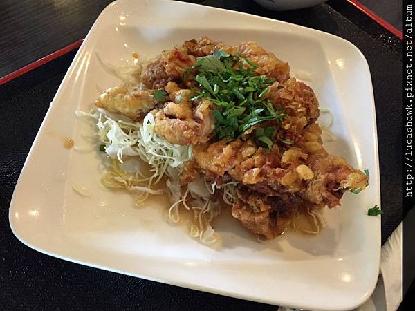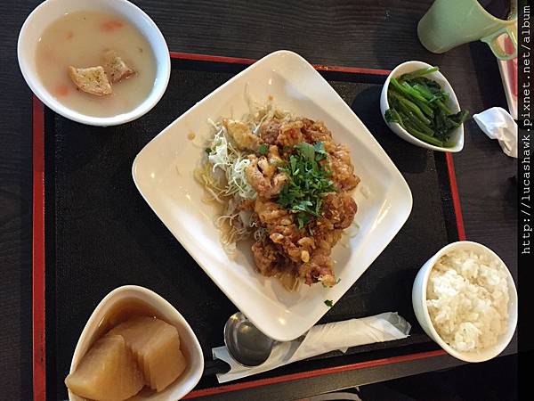 今天配菜是菠菜,跟魯蘿蔔,還有玉米濃湯,白飯也是相當有份量,不怕吃不飽。這是椒麻雞,份量也是著實大塊,看起來就很吸引人,外皮酥脆,肉質鮮嫩。