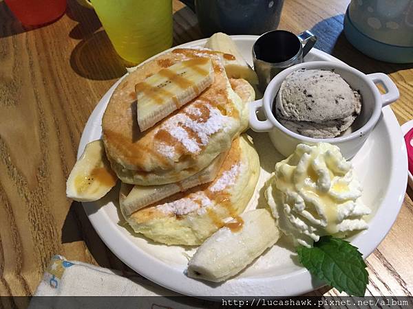 這個就是大家最推的「瑞可達乳酪熱煎餅」,溫熱的日式厚煎餅 舒芙蕾,搭配乳酪跟冰淇淋,淋上糖漿,簡直就是天堂級的滿足啊~~