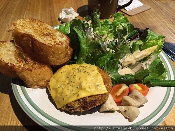 喜歡吃歐系麵包的老婆,就點了布丁煎法國香榭麵包搭配自製甜蘿勒起司漢堡肉,這個麵包外酥內軟,相當可口,我比較愛這塊披著起司的超厚漢堡肉,鹹度剛好,肉也不會鬆垮,我真的超愛漢堡肉搭配起司,一大口給他放下去,肉汁的鮮甜夾帶香濃起司,整個被征服了!!學妹點了手工馬鈴薯蜂蜜麵包,這個麵包好柔軟,真是不錯!!!可惜忘了拍,哈!!