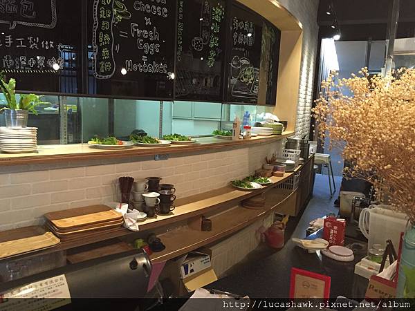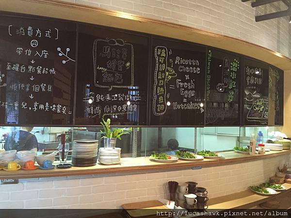 櫃台後面就是廚房,特色菜就寫在黑板上面,乾淨的吧檯讓人覺得舒服,透明的作業空間,