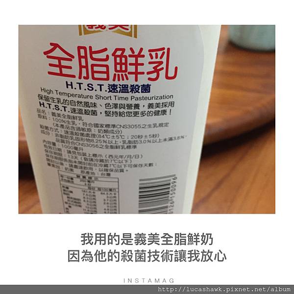 =>我採用保久乳或是義美全脂鮮奶,因為保久乳可以殺死百分之99的細菌(但是營養有損),義美的殺菌技術保存最多營養下來,又不會殺死好菌(我個人最推)