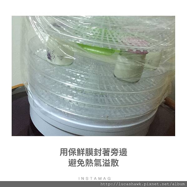 接著,用保鮮膜封住乾果機周圍,因為乾果機的夾層每一層不夠高,但是為了hold住溫度,刻苦一點用保鮮膜封住,哈~~